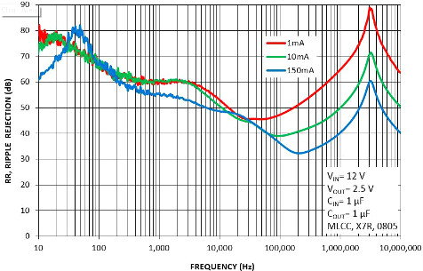 B)輸入電壓的快速變化(通常是由 DC-DC 轉換器的輸出電壓紋波引起的)無法通過控制回路完全過濾,于是輸入電壓的變化會一定程度地反映在輸出電壓中,該參數稱為電源抑制比(PSRR),且通常是頻變參數。一般而言,PSRR 絕對值越高,從輸入到輸出的傳輸干擾信號就越少。通常情況下,受到干擾的輸入電壓會以 mV 或更低的單位級別傳輸至輸出端。相似地,輸入電壓的快速變化(即“線路瞬態(tài)響應”)可發(fā)生于 LDO 輸出端。