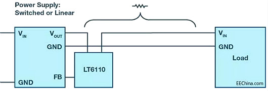 第二種方案是使用LT6110 這類專用線路壓降補償 IC。將此 IC 插入電壓發(fā)生側,并測量進入連接線之前的電流。然后根據測得的電流來調節(jié)電源的輸出電壓,從而能夠非常精確地調節(jié)負載側電壓,而不用考慮負載電流。
