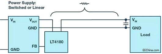 如果在器件工作期間線路電阻可能會發(fā)生變化,可使用LT4180 這類元件,在負載側具有輸入電容時,通過交流信號對連接線電阻進行虛擬預測,從而為負載端提供高精度電壓。