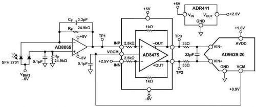 高速光電二極管信號調理電子線路圖介紹本文聚焦于一款高速光電二極管信號調理電路,其具備暗電流補償功能,旨在高效轉換高速硅 PIN 光電
